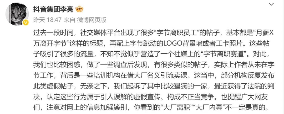 同日,抖音集團副總裁李亮也發文稱:“過去一段時間,社交媒體平台出現了很多字節離職員工的帖子,基本都是月薪X萬離開字節這樣的標題凱時AG登錄入口,再配上字節跳動的LOGO背景牆或者工卡照片凱時官網。這些帖子吸引了很多的流量,不知不覺似乎營造了一個社媒上的字節離職賽道。”
